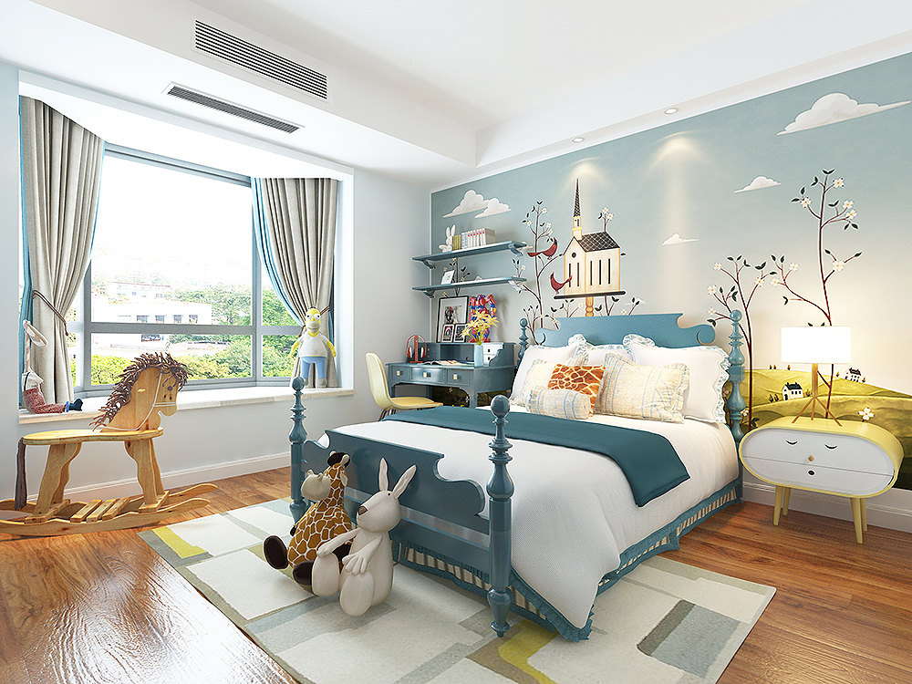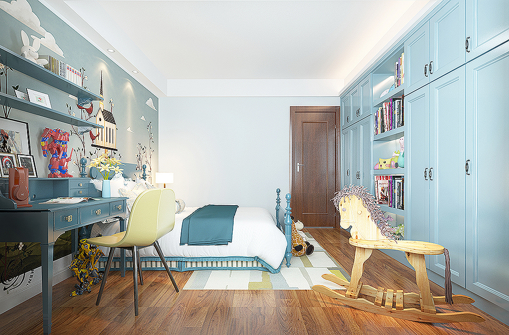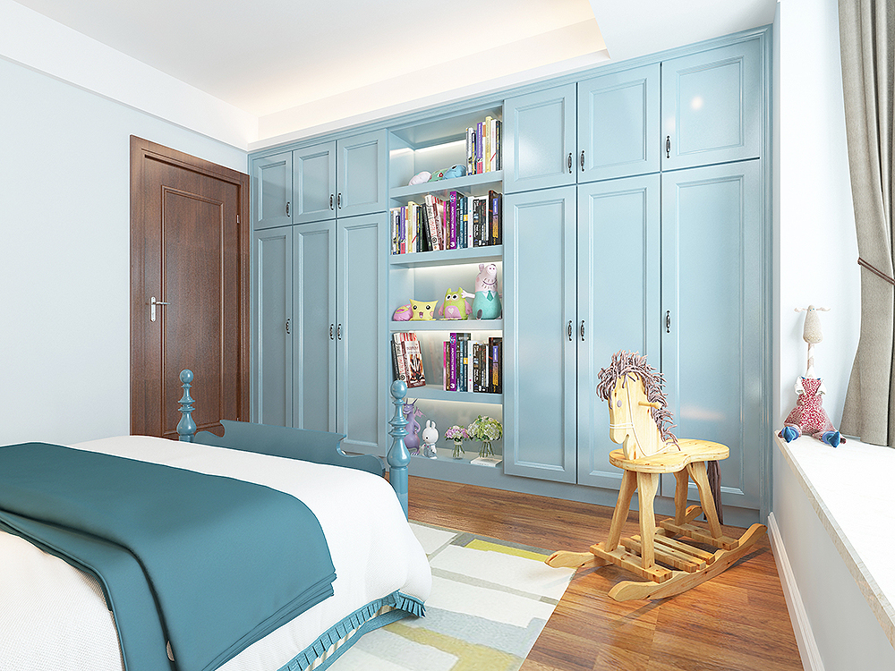 进门侧边打造一排蓝色衣柜,经典美观,中间部分留空做书柜,放置书籍,安装内嵌灯带,整体看上去更加好看;而床头背景的淡蓝色卡通风景画,搭配蓝色木质公主床,清新干净,就像在编织一个个幸福的公主梦;飘窗做了软垫,阳光明媚的周末,可以躺在这儿晒晒太阳,看看风景,舒服又温馨。