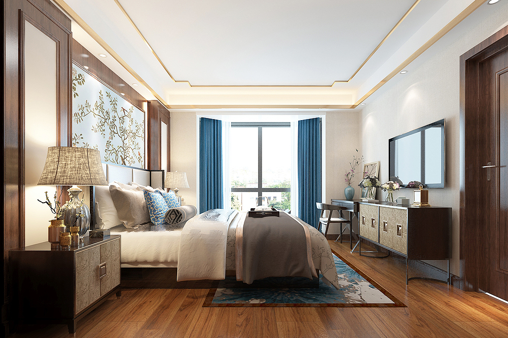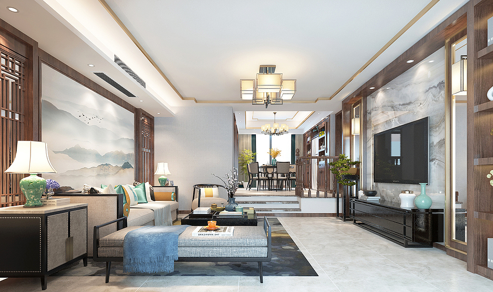 沙发背景墙以格栅为背景,中间设计简约而古朴的中式山水画,不仅优雅大气,还尽显时尚韵味;沙发打破传统中式繁琐,创造新中式时尚感,简洁的造型在几条线条的点缀下也是一种美;而电视墙以灰色水墨纹为背景,让静谧的空间有了画龙点睛之笔。